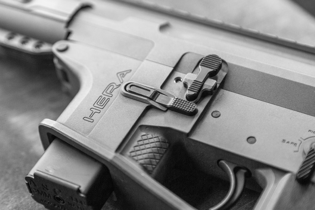 Kvalitní poloautomatická pistolová karabina německé firmy Hera Arms 9ers - s délkou hlavně 10". Ráže 9 mm Luger. Stoupání hlavně je 1/10. Zbraň je osazena montážní lištou weaver 22 mm pro umístění optického zařízení a jiného příslušenství nad hlaveň. Předpažbí je vybaveno montážním systémem typu key-mode. Hlaveň je osazena úsťovou brzdou PCC (sport) z produkce firmy Hera Arms. Pistolová rukojeť má krytý prostor v rukojeti pro příslušenství (baterie,...). Pevná pažba typu A2. Zásobníky Glock 9 mm Luger (zbraň je také možné objednat s konverzí pro zásobníky Colt). Barva cerakot bronz.