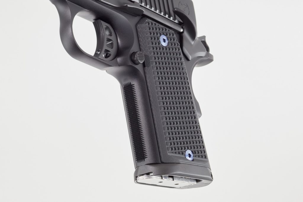 Dalším prvkem, který je součástí tohoto modelu, je ultra vysoký podříznutý lučík spouště, takže většina velkých rukou se stále vejde na rukojeť. Nakonec tu máme střenky z materiálu G10, které byly pro tuto pistoli vyrobeny na zakázku s Railscales a „jsou tenčí než nejtenčí rukojeti 1911 dostupné na trhu“.