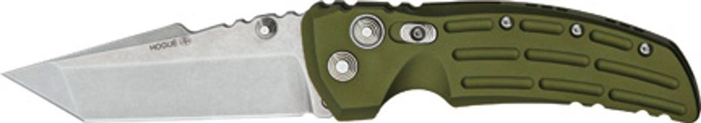 Nůž Hogue EX-01 Tanto Blade 4" Aluminium Green, který navrhnul Allen Elishewitz. Čepel Tanto s oboustranými palcovými čepy. Materiál čepele je z kryogenicky ošetřené nerezové oceli 154CM (tvrdost 57-59 HRC) s ručně broušeným ostřím. Zámek PushButton s manuální pojistkou pro uzamčení. Rukojeť je hliníková. Pocket clip je vpravo, střenka obsahuje průvlak pro lanyard. Celková délka nože 225 mm, délka čepele 102 mm a délka rukojeti 123 mm. Vyrobeno v USA.