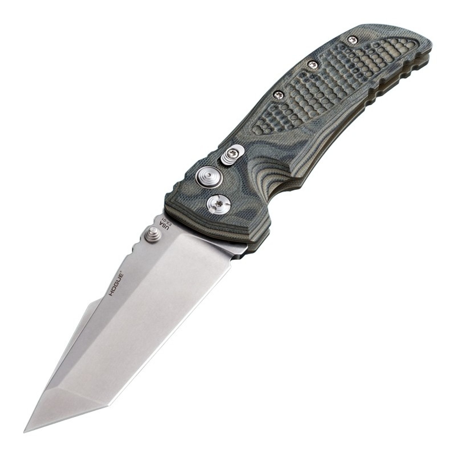 Nůž Hogue EX-01 Tanto Blade 4" G10 G-Mascus Green, který navrhnul Allen Elishewitz. Čepel Tanto s oboustranými palcovými čepy. Materiál čepele je z kryogenicky ošetřené nerezové oceli 154CM (tvrdost 57-59 HRC) s ručně broušeným ostřím. Zámek PushButton s manuální pojistkou pro uzamčení. Rukojeť je G-10 G-Mascus s texturou Mini Piranha. Pocket clip je vpravo, střenka obsahuje průvlak pro lanyard. Celková délka nože 225 mm, délka čepele 102 mm a délka rukojeti 123 mm. Vyrobeno v USA.