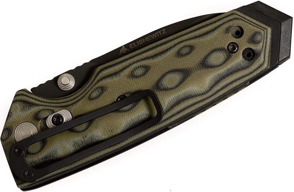 Zavírací nůž Hogue EX-02 3.375" Tanto Thumb G-10 G-Mascus Green, který navrhnul Allen Elishewitz. Čepel Tanto z kryogenicky ošetřené nerezové oceli 154CM (tvrdost 57-59 HRC) s povrchovou úpravou černý cerakote. Zámek PushButton s manuální pojistkou. Rukojeť G-10 G-Mascus s texturou Mini Piranha. Pocket clip je vpravo, střenka obsahuje díru pro lanyard. Celková délka nože 200 mm, délka čepele 86 mm a délka rukojeti 114 mm. Vyrobeno v USA.