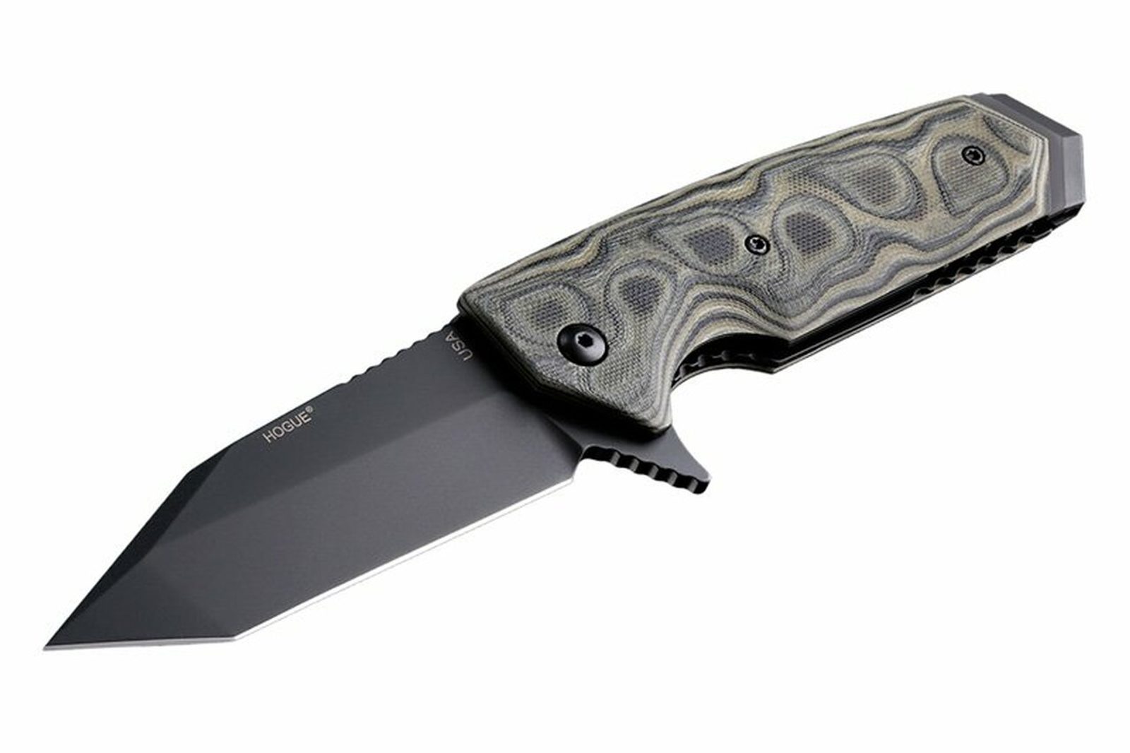 Zavírací nůž Hogue EX-02 3.75" Tanto Flipper G-10 G-Mascus Green, který navrhnul Allen Elishewitz. Čepel Tanto z kryogenicky ošetřené nerezové oceli 154CM (tvrdost 57-59 HRC) s povrchovou úpravou černý cerakote. Zámek PushButton s manuální pojistkou. Rukojeť G-10 G-Mascus s texturou Mini Piranha. Pocket clip je vpravo, střenka obsahuje díru pro lanyard. Celková délka nože 222 mm, délka čepele 95 mm a délka rukojeti 127 mm. Vyrobeno v USA.
