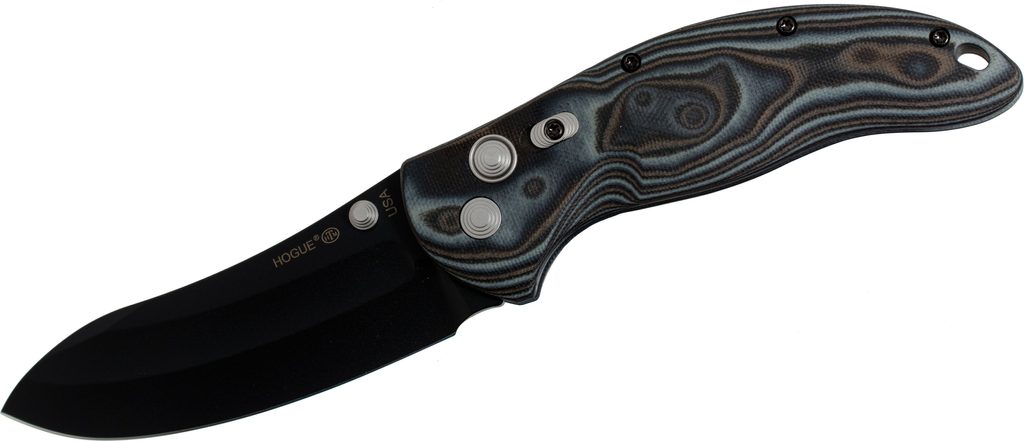 Zavírací nůž Hogue EX-04 4" Upswept G-10 Gray Lava, který navrhnul Allen Elishewitz. Čepel Upswept z kryogenicky ošetřené nerezové oceli 154CM (tvrdost 57-59 HRC) s povrchovou úpravou černý cerakote. Zámek PushButton s manuální pojistkou. Rukojeť z materiálu G-10 G-Mascus s texturou Mini Piranha. Pocket clip je vpravo, střenka obsahuje díru pro lanyard. Celková délka nože 203 mm, délka čepele 89 mm a délka rukojeti 130 mm. Vyrobeno v USA.