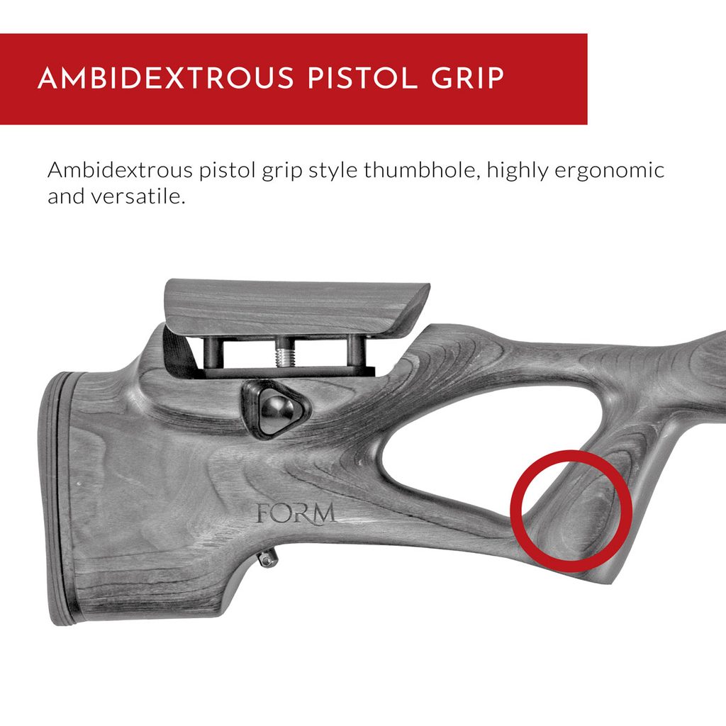 Vysoce ergonomický oboustranný design s pistolovou rukojetí a neklouzavým povrchem. Tato pažba je vhodná pro praváka i leváka a je ideální volbou pro většinu loveckých a sportovních použití.