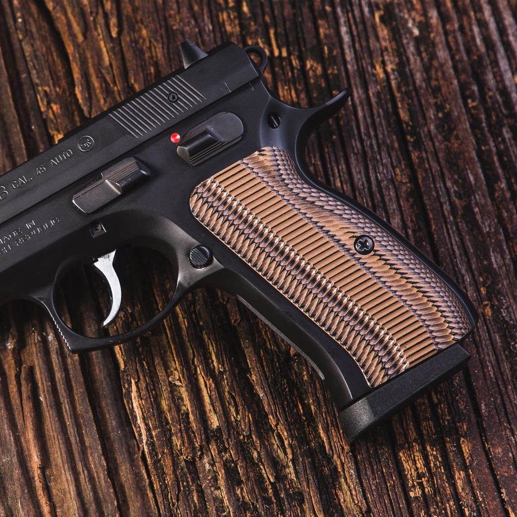- Pevnost materiálu G10 umožňující nejtenčí možné rukojeti pro pistole s dvojitým zásobníkem.
