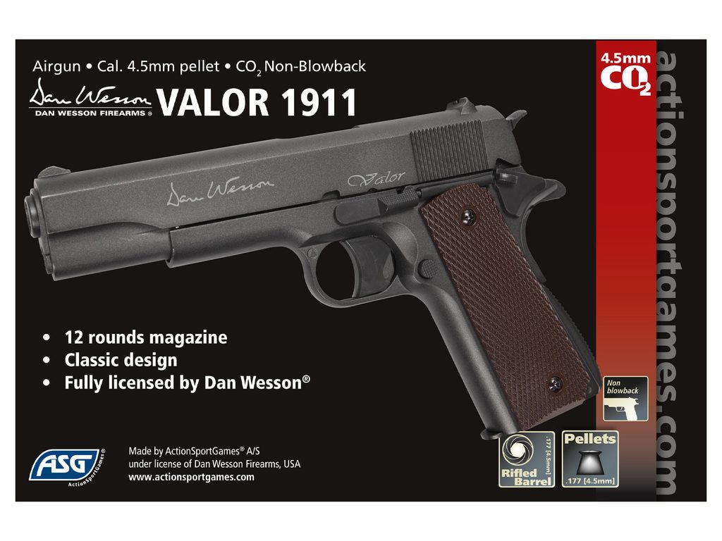 Vzduchová pistole ASG Dan Wesson Valor 1911 4,5mm je celokovová replika prémiové pistole Dan Wesson Valor 1911. Výroba ostré verze spadá pod Českou Zbrojovku. Pistole je určena pouze na olověné diabolky, které se vkládají spolu s bombičkou do věnečkového zásobníku. Pistole má drážkovanou hlaveň pro ještě větší přesnost, spoušť i lučík jsou vyrobeny z kovu. Vzhled i váha pistole jsou velice autentické díky kovové konstrukci. Úsťová rychlost činí cca 100 - 110 m/s, výdrž bombičky cca 50-60 výstřelů v závislosti na rychlosti střelby a okolní teplotě. Kapacita zásobníku je 12 ran.