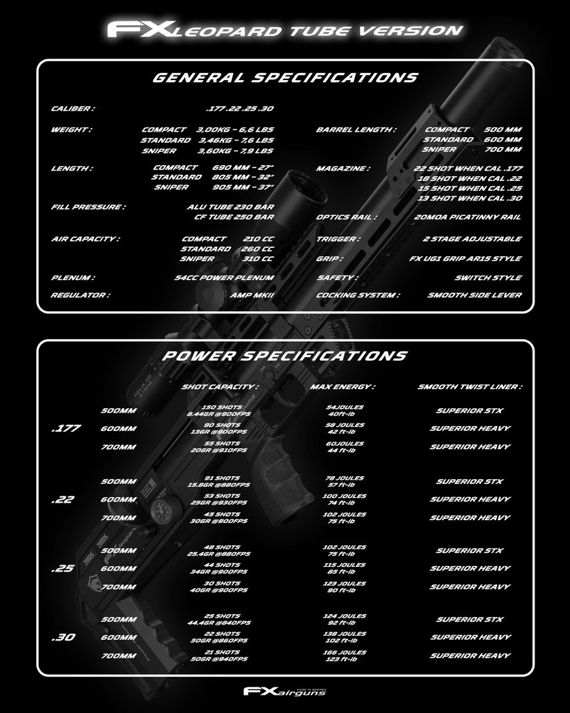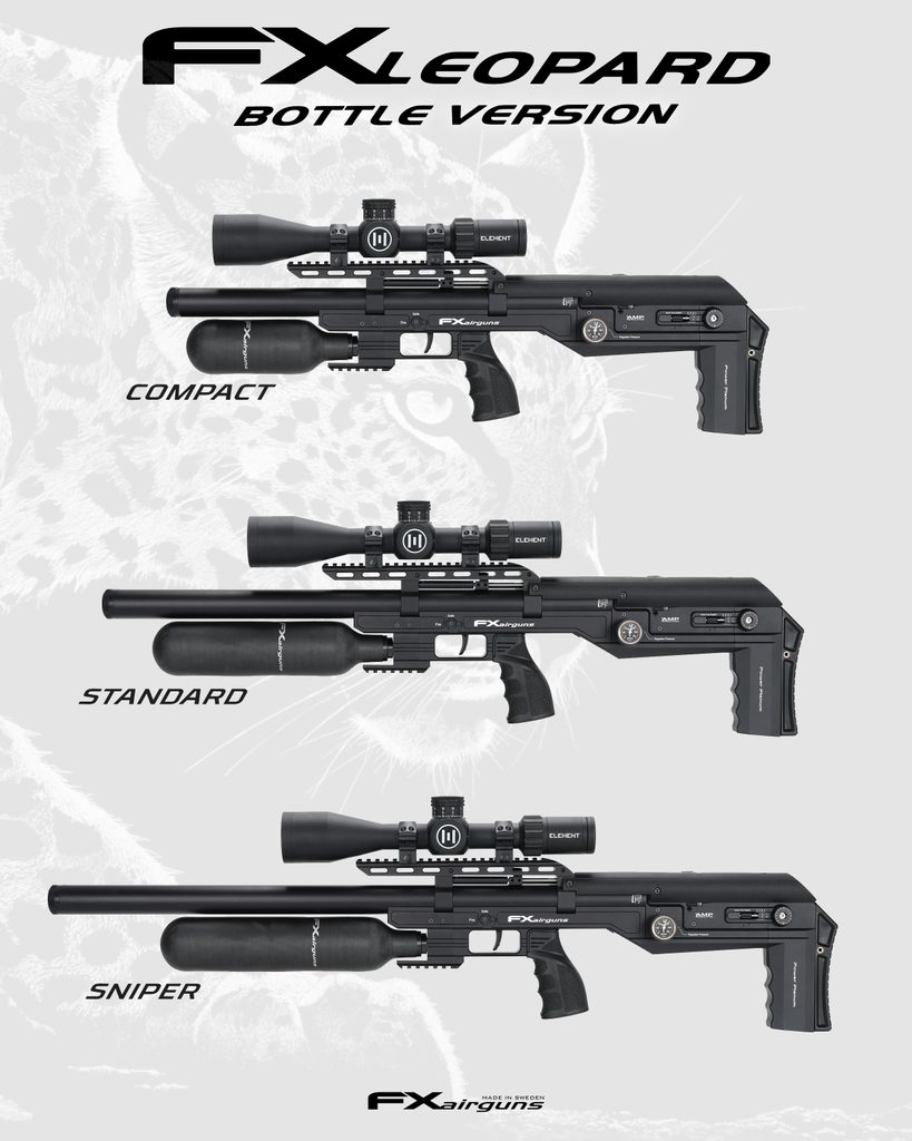 Leopard kombinuje to nejlepší z všech posledních modelů vzduchovek FX. Kartuši okolo hlavně, detailně a snadno nastavitelný výkon, externě nastavitelný regulátor, sportovní nastavitelnou spoušť, pogumovanou rukojeť v AR stylu.